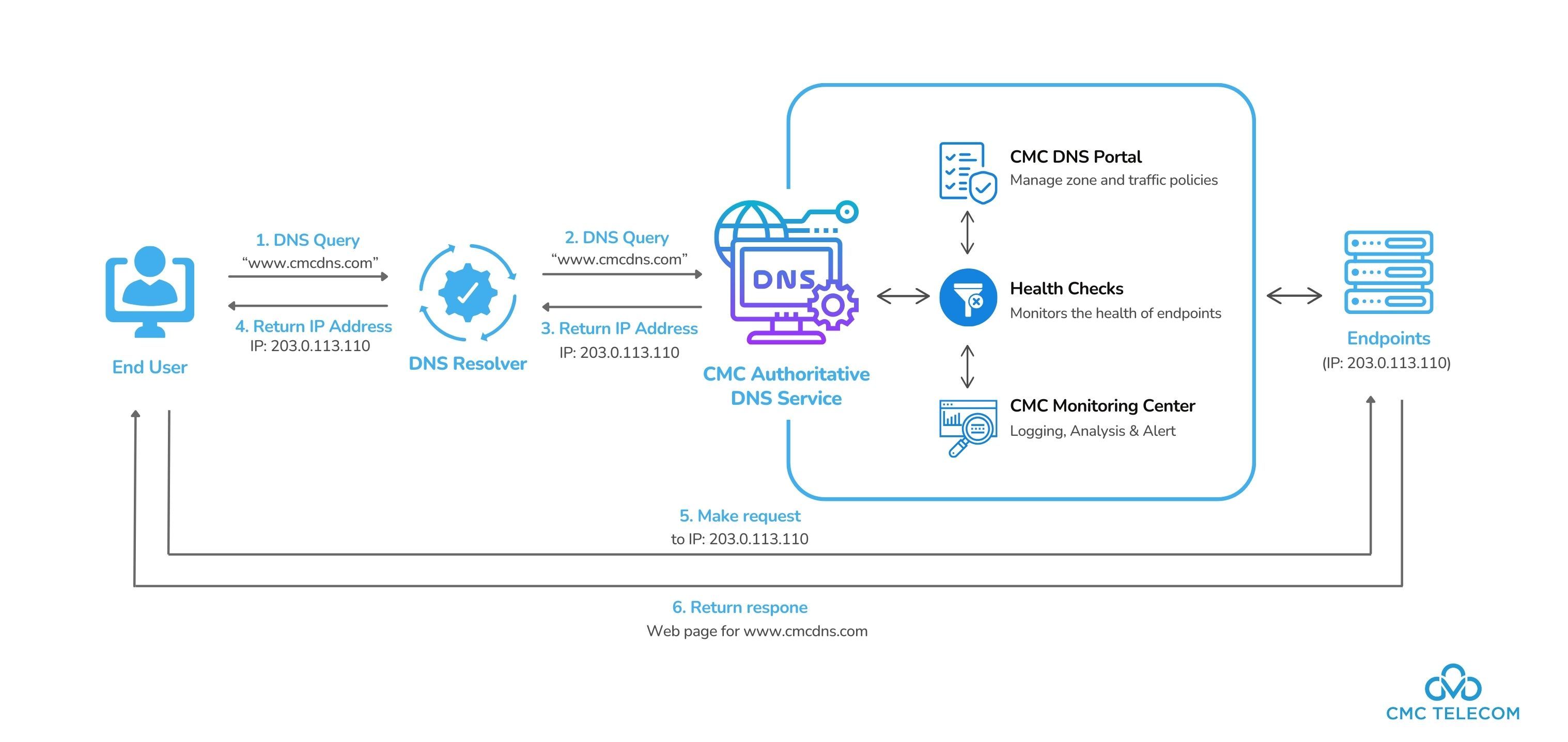 - CMC Authoritative DNS Service: Khi DNS Resolver không có thông tin IP trong bộ nhớ cache, nó sẽ gửi truy vấn lên CMC DNS Service. Đây là dịch vụ DNS có quyền quản lý và lưu trữ các bản ghi DNS chính thức của tên miền. CMC DNS chịu trách nhiệm tra cứu địa chỉ IP chính xác cho tên miền được yêu cầu. Trong ví dụ này, nó tìm và trả về địa chỉ IP 203.0.113.110 cho tên miền www.cmcdns.com.