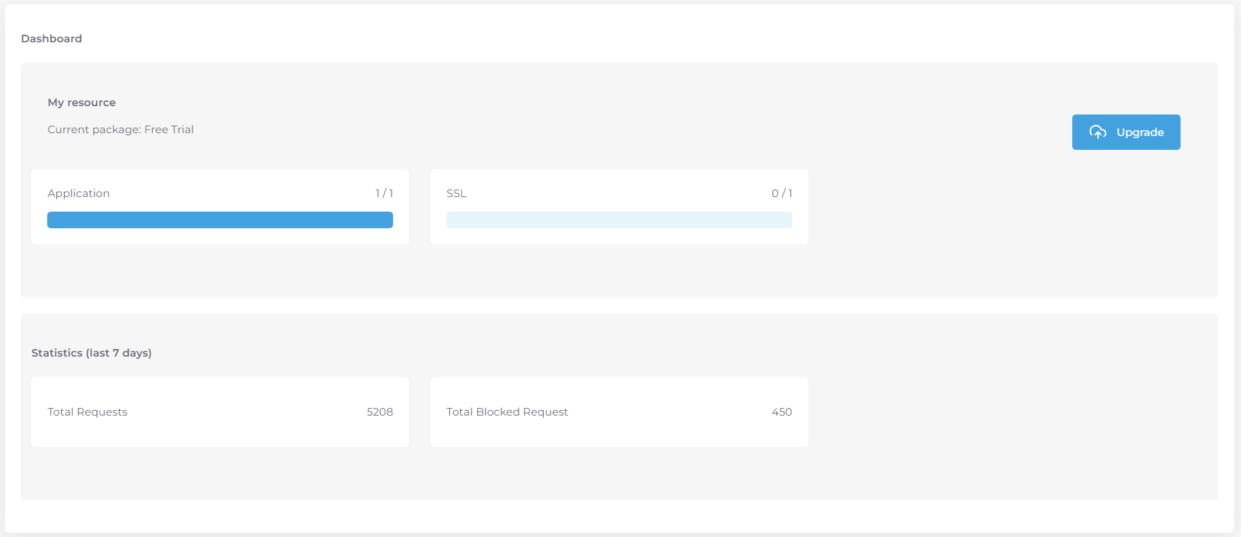 Note: Giới hạn sẽ thay đổi tùy theo gói Package đã đăng ký. Gói Free Trial giới hạn mặc định ở 1 Application và 1 Chứng chỉ SSL. - Total Request: Tổng số yêu cầu đã được xử lý