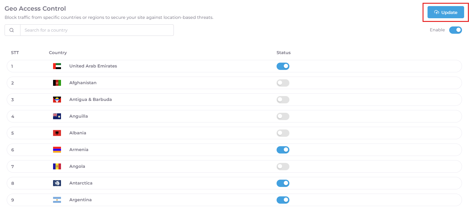 Lưu ý: Khi thay đổi danh sách các quốc gia mong muốn chặn Request, cần bấm Update để cập nhật thông tin cấu hình hệ thống.