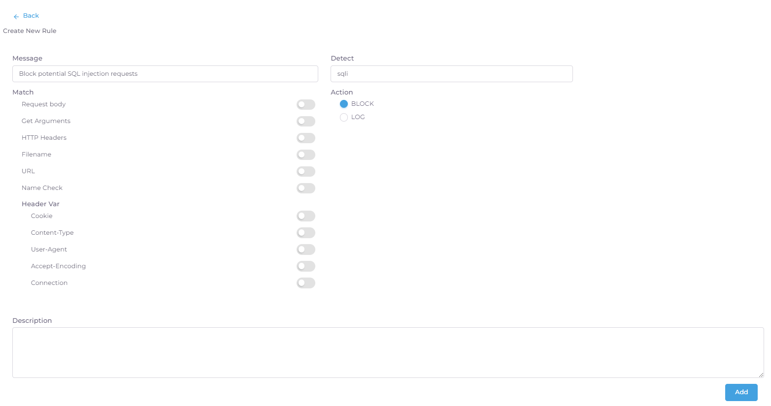 - Message: Cung cấp mô tả ngắn gọn về mục đích và nội dung của quy tắc đó. Ví dụ "Block potential SQL injection requests"