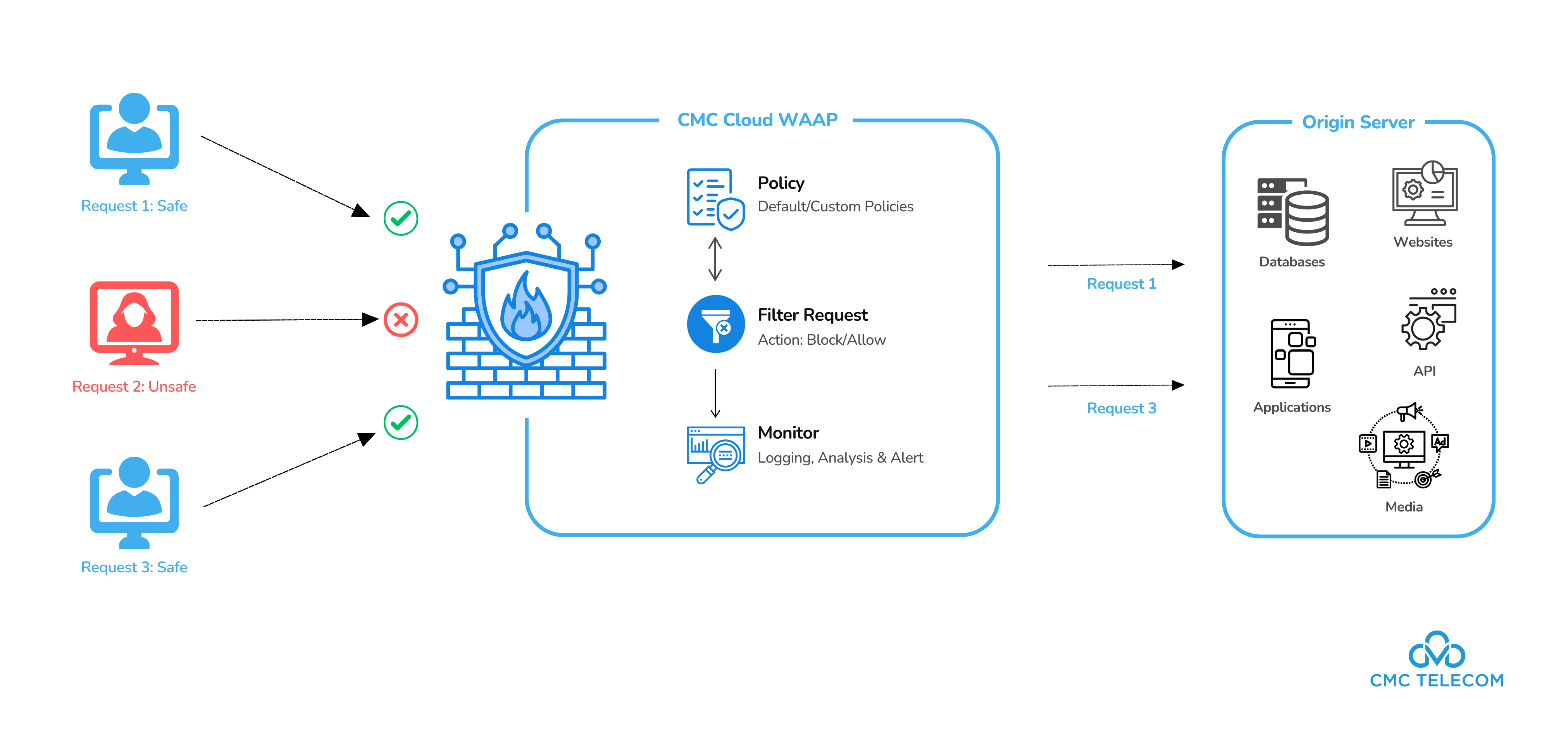 Giải pháp tường lửa ứng dụng Web CMC - CMC Cloud Web Application and API Protection (CMC Cloud WAAP) là một giải pháp được tích hợp trên Cloud, giúp bảo vệ trang web và các APIs khỏi các cuộc tấn công và mối đe dọa. Với tập quy tắc (rule) mạnh mẽ và dễ dàng tùy chỉnh, cùng việc tích hợp trí tuệ nhân tạo AI giúp phát hiện các hành vi bất thường, CMC Cloud WAAP giúp doanh nghiệp nhanh chóng phát hiện và bảo vệ ứng dụng Web và API trước các mối đe dọa và lỗ hổng bảo mật.
